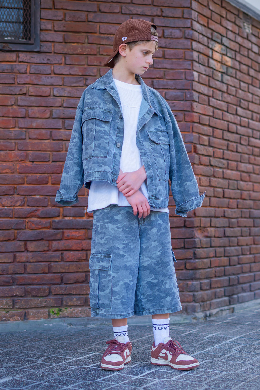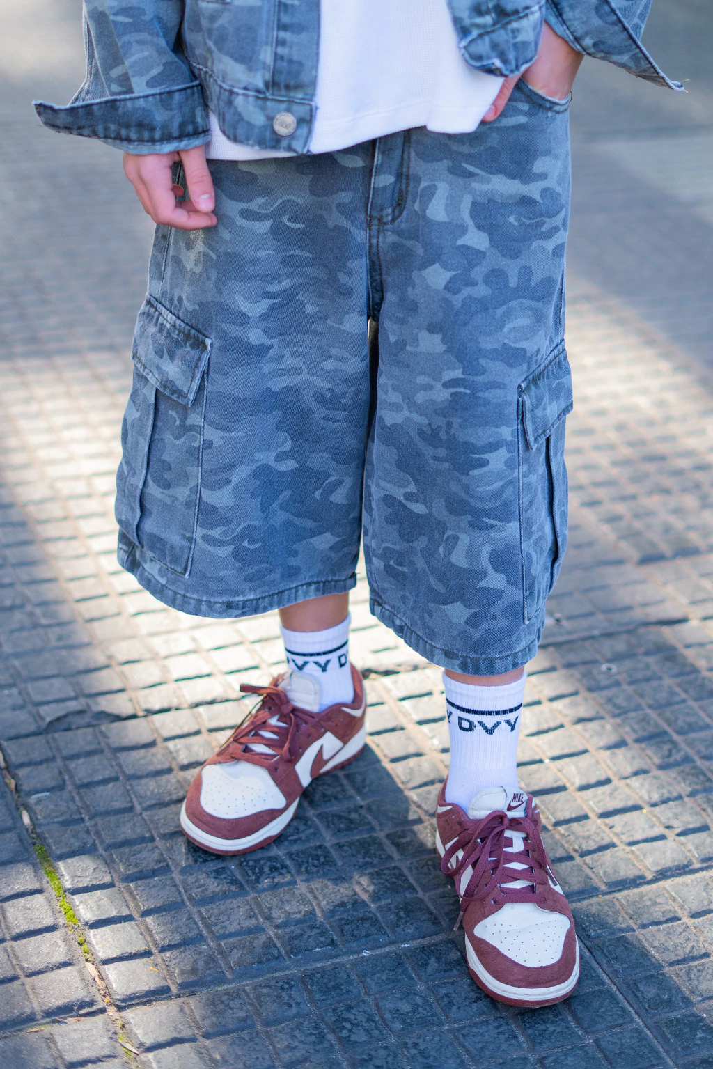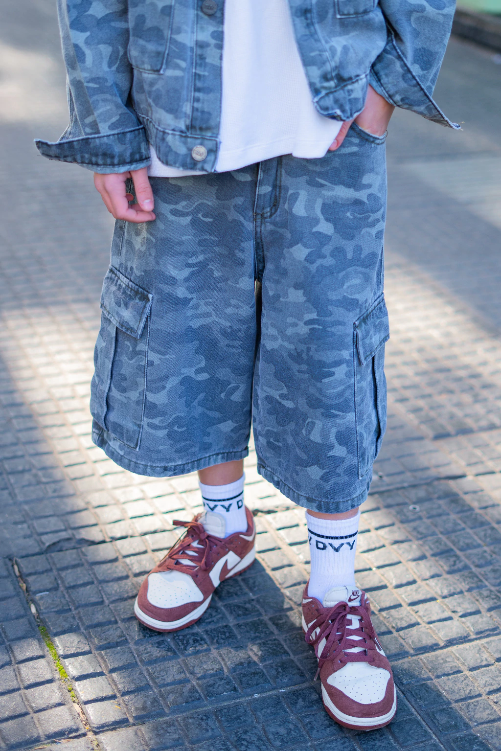 bermuda de gabardina camuflada cargo over. Detalle de prelavado que le da efecto gastado. Unisex!
