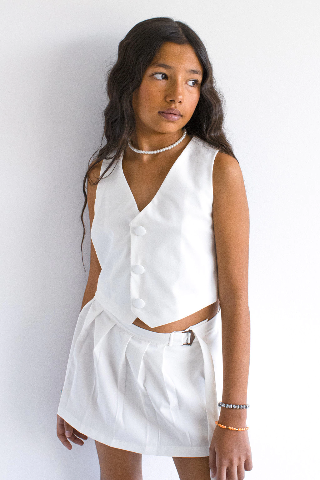 Pollera sastrera tableada irregular con detalle de hebilla para ajustar a medida.