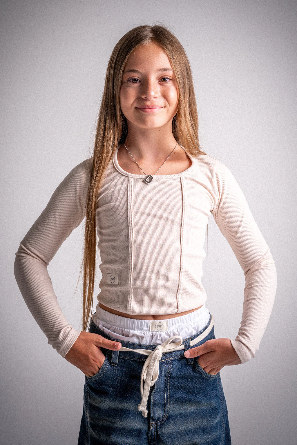 Top manga larga de morley ajustado tipo corset! Color único, detalle de grifa dvy.